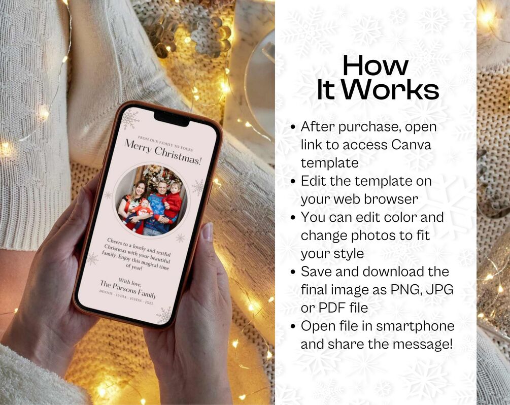 After purchase, open link to access the template. Visit www.canva.com, create an account, and edit your template on your web browser. You can edit color and change photos to fit your style. Then, save and download the final image as a PNG, JPG, or PDF file. Finally, open the file on your smartphone and share the message. The template will work with both free and Canva Pro accounts.