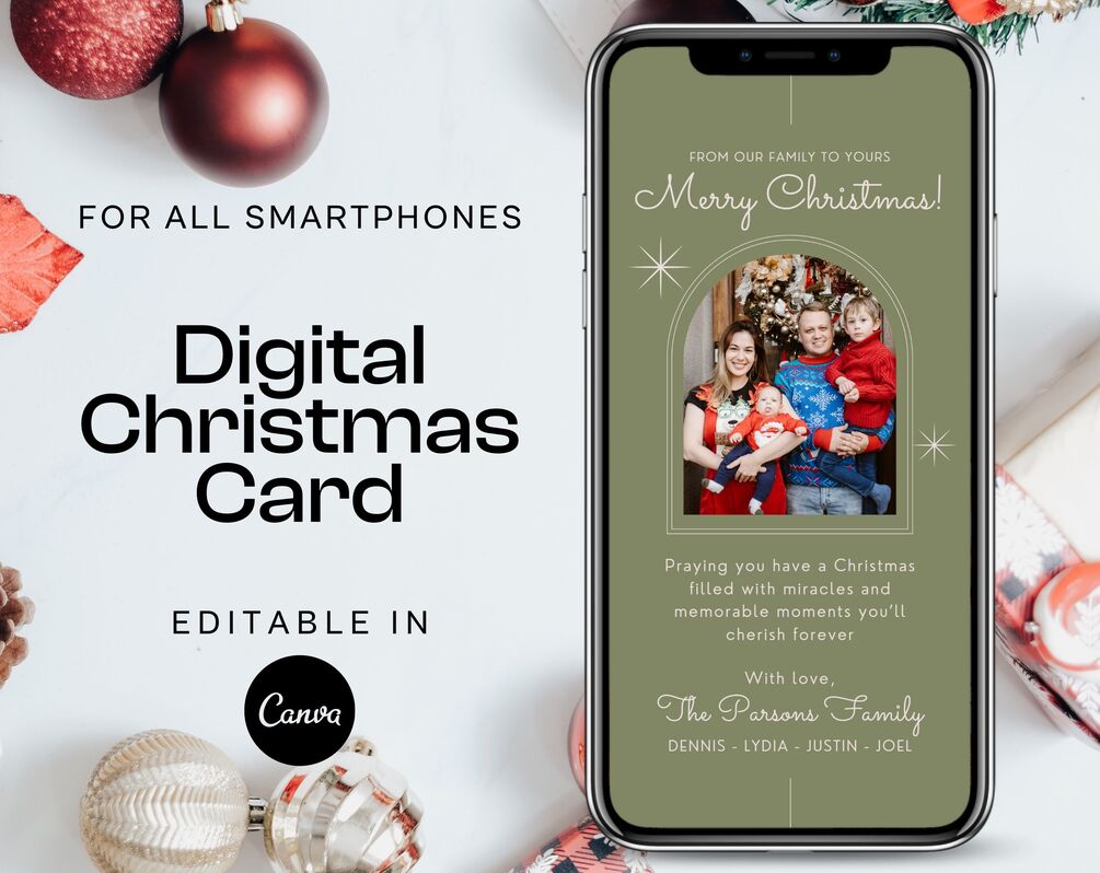 Send an elegant digital Christmas card with this minimalist editable template. With Canva applications, quickly edit your holiday messages, add photos and share the card via smartphone.
